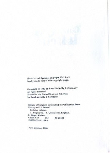 Nobody Said It Better! is an engaging and highly browsable collection of 2,700 sharp, witty, and memorable quotations drawn from famous figures across history, politics, literature, entertainment, and public life. Compiled with a keen editorial eye by Miriam Ringo, the book balances humor and insight, offering remarks that are clever, revealing, and often unexpectedly human.
