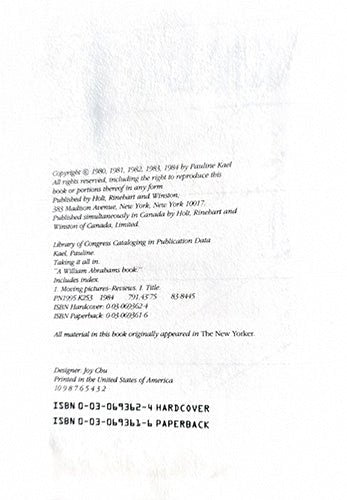Taking It All In is a vibrant collection of film criticism by Pauline Kael, America’s most influential and fearless movie reviewer. With her trademark wit, honesty, and sharp insight, Kael explores the films of the late 1970s and early 1980s—an era of bold directors, rising stars, and unforgettable storytelling.