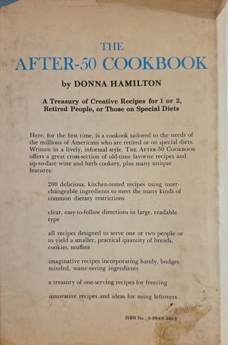 Written for people cooking later in life—or simply cooking more thoughtfully—The After-50 Cookbook by Donna Hamilton is a practical and warmly written vintage cookbook designed for smaller households and special dietary needs. First published in the 1970s, it reflects a time when home cooking emphasized clarity, economy, and nourishment rather than trend-driven complexity.