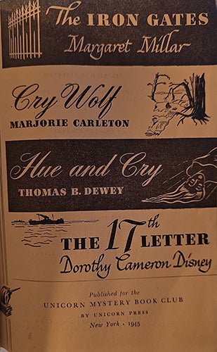 Description: This 1945 Unicorn Mystery Book Club omnibus gathers four suspenseful novels from some of the most intriguing mystery writers of the mid-twentieth century: Margaret Millar’s The Iron Gates, Marjorie Carleton’s Cry Wolf, Thomas B. Dewey’s Hue and Cry, and Dorothy Cameron Disney’s The 17th Letter.