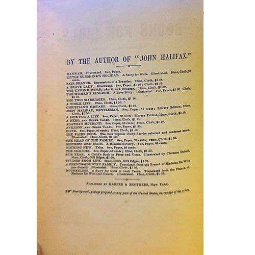 This finely crafted Victorian edition belongs to Harper’s celebrated Books for Girls series, a pioneering collection designed to provide uplifting and morally instructive reading for young women. Written by Dinah Maria Mulock Craik—one of the 19th century’s most beloved women authors—this volume embodies the moral and literary ideals of its era: self-discipline, compassion, courage, and feminine virtue.